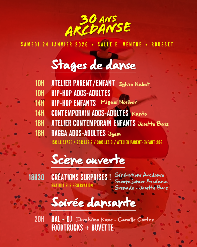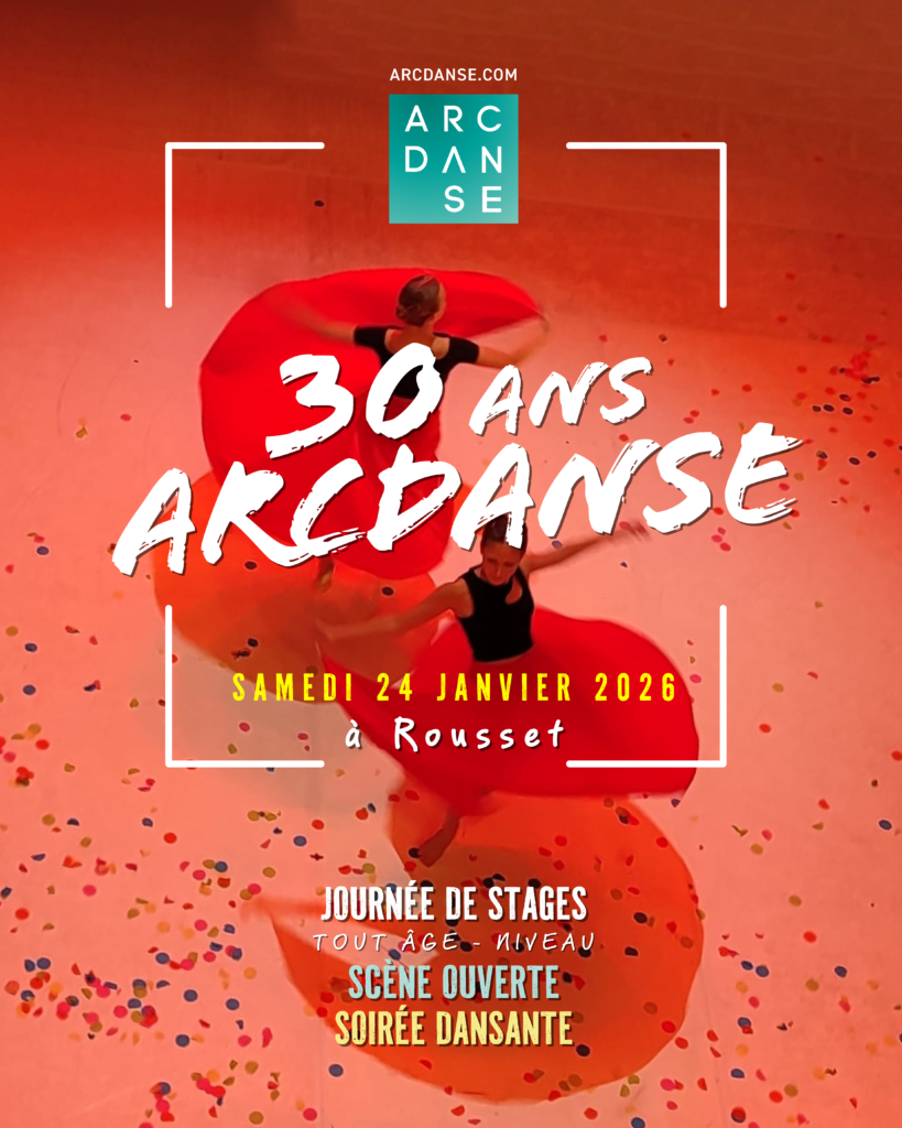 SAMEDI 24 JANVIER 2026 : Arcdanse fête ses 30 ans ! Une journée de stages suivie d’une grande soirée festive pleine de surprises…